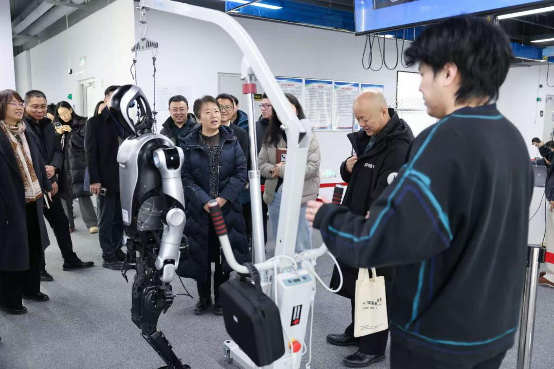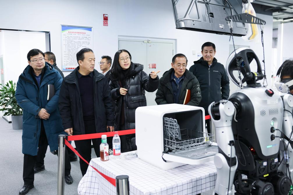该数据训练中心由石景山区政府牵头,京石科创集团、国内人形机器人领军企业乐聚机器人联合运营,是北京市首个人形机器人数据训练中心,也是国内规模最大的人形机器人训练场。中心组一行聚焦“具身智能”战略性新兴产业发展动态与人才需求,实地参观了智能制造、商务服务、家庭服务等多个应用场景训练区,详细观摩典型仿真场景,深入了解人形机器人从数据采集、清洗、标注、验证到质量评估的全链条标准化流程,以及多模态数据融合、“感知 - 决策 - 执行”闭环构建等前沿技术实践,切实把握产业发展脉搏与人才需求导向。