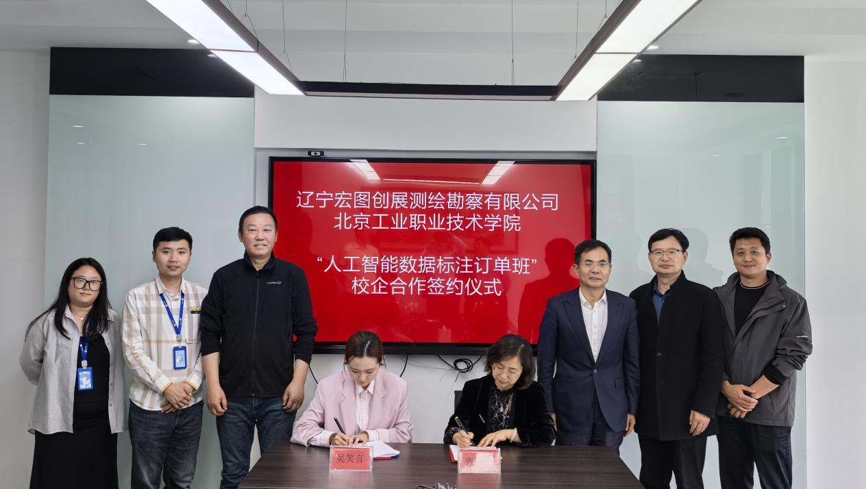 4月21日,北京工业职业技术学院与辽宁宏图创展测绘勘察有限公司“人工智能数据标注订单班”签约仪式在企业会议室举行。辽宁宏图创展测绘勘察有限公司总经理韩国超、人力资源经理吴笑言,北京工业职业技术学院党委常委、副院长史运涛,建工学院院长张丽丽、产教融合办公室主任王佼以及企业代表、教师代表等参加签约仪式。
