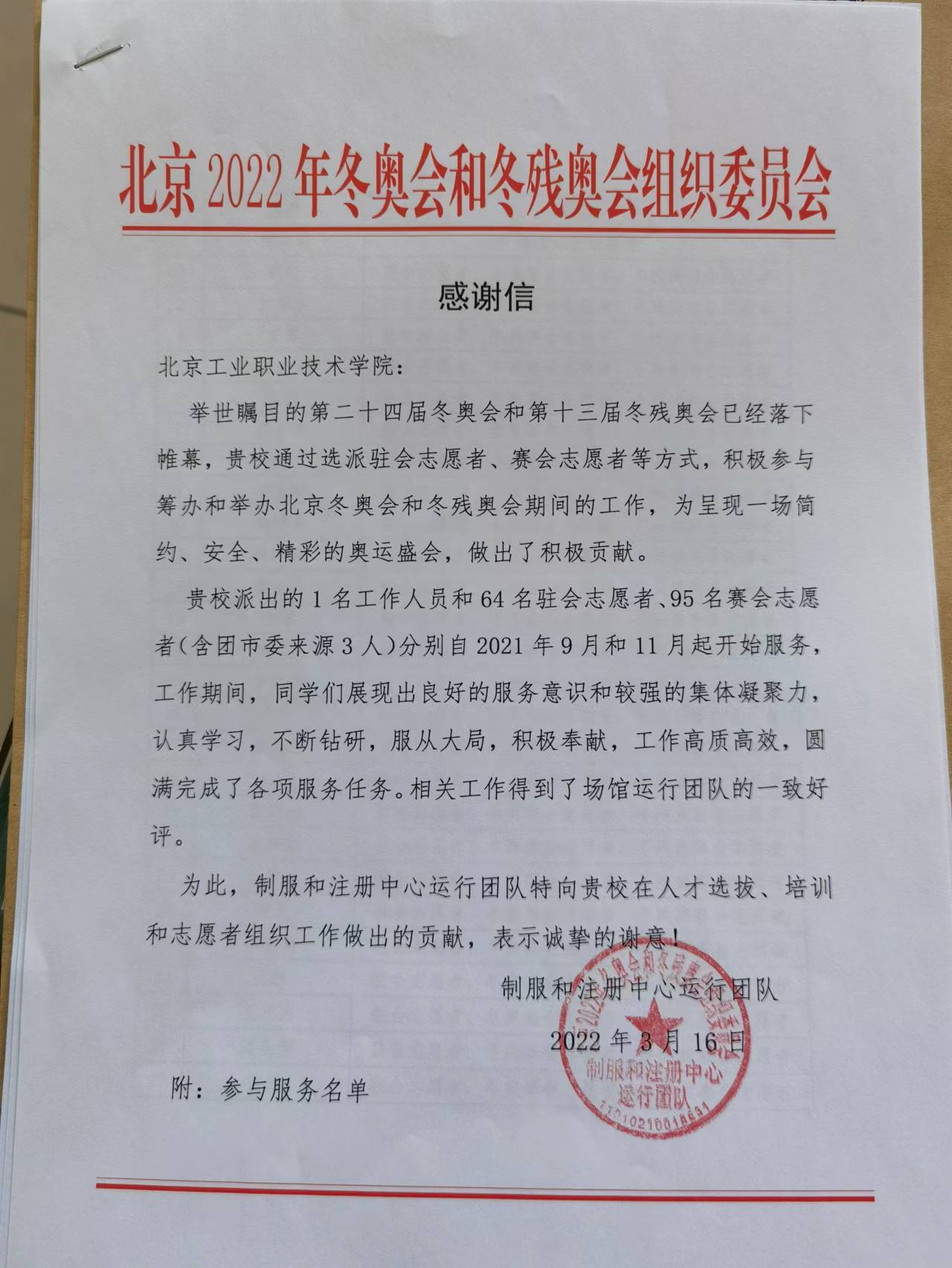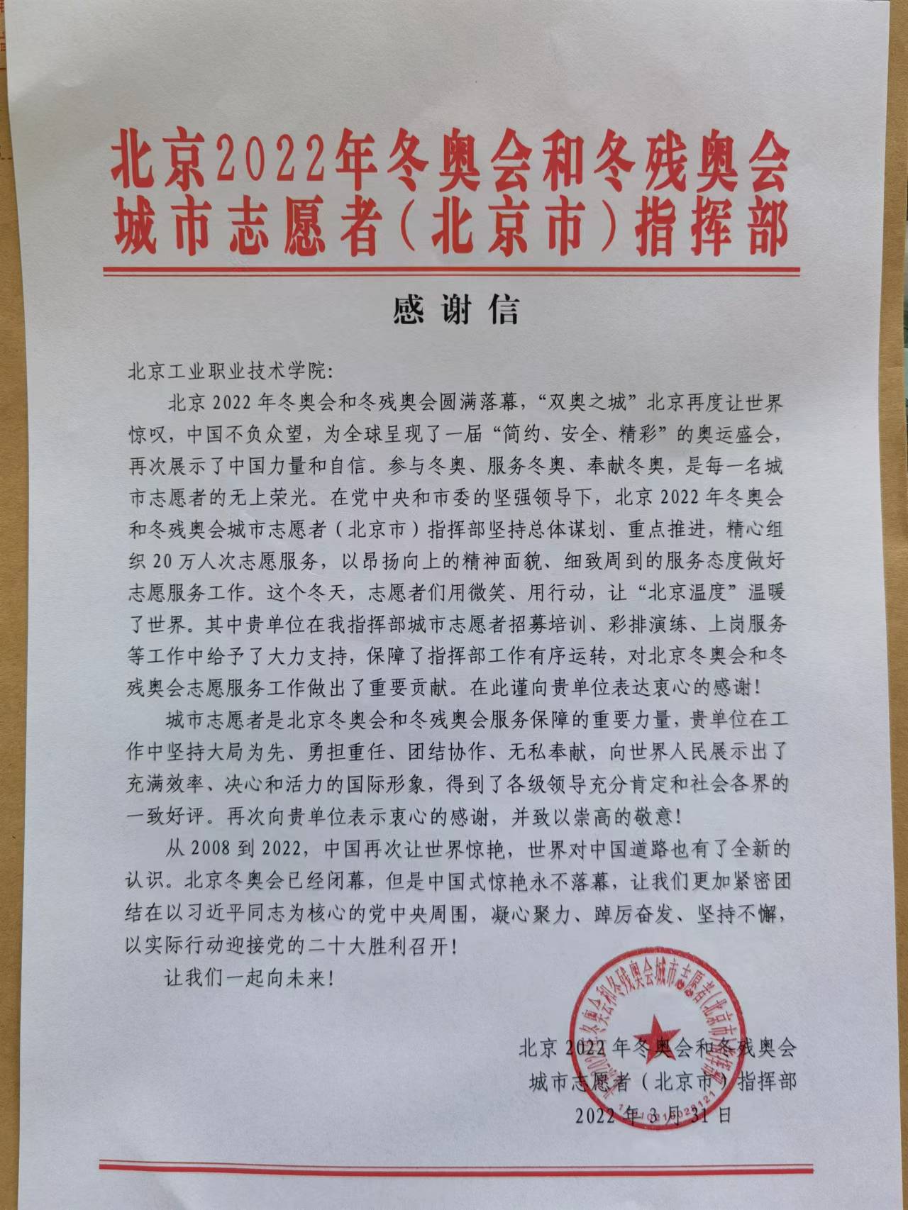 北京2022年冬奥会和冬残奥会城市志愿者(北京市)指挥部在感谢信中提到,我校在“城市志愿者招募培训、彩排演练、上岗服务等工作中给予了大力支持,保障了指挥部工作有序运转,对北京冬奥会和冬残奥会志愿服务工作做出了重要贡献。”,对我校表达衷心的感谢!