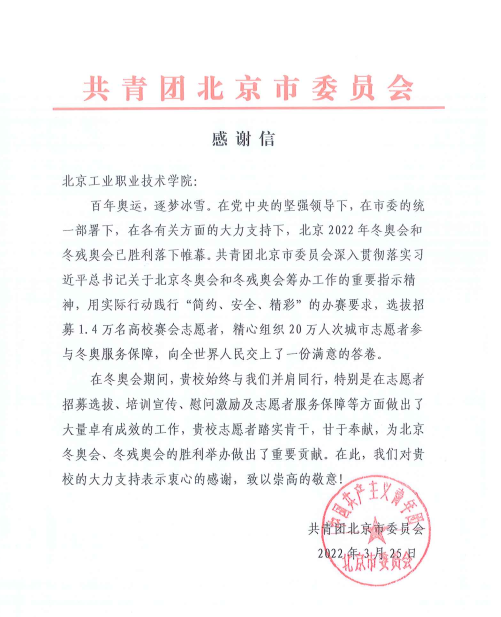 共青团北京市委员会在感谢信中表示,“在冬奥会期间,贵校始终与我们并肩同行,特别是在志愿者招募选拔、培训宣传、慰问激励及志愿者服务保障方面做出了大量卓有成效的工作,贵校志愿者踏实肯干,甘于奉献,为北京冬奥会、冬残奥会的胜利举办做出了重要贡献。”,对我校的大力支持表示衷心感谢!