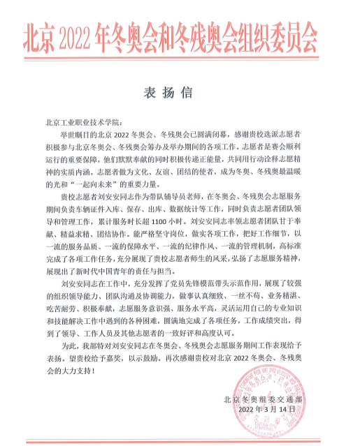北京冬奥组委交通部在表扬信中高度称赞我校带队辅导员老师刘安安在志愿服务期间的表现,信中指出,“刘安安同志率领志愿者团队甘于奉献、精益求精、团结协作。能严格坚守岗位、做实各项工作,把好工作细节,以一流的服务品质、一流的保障水平、一流的纪律作风、一流的管理机制,高标准完成了各项工作任务,充分展现了贵校志愿者师生的风采,弘扬了志愿服务精神,展现出了新时代中国青年的责任与担当。”感谢我校对北京冬奥会、冬残奥会的大力支持!