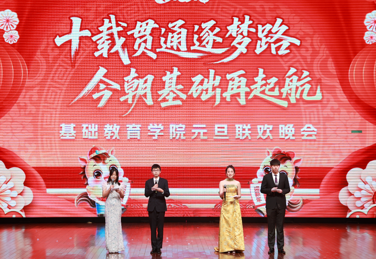 12月23日,图书馆礼堂灯火璀璨、暖意融融。基础教育学院以“十载贯通逐梦路,今朝基础再起航”为主题的2026年元旦联欢晚会在此盛大启幕,全院师生欢聚一堂,共赴一场青春与梦想交织的视听盛宴。