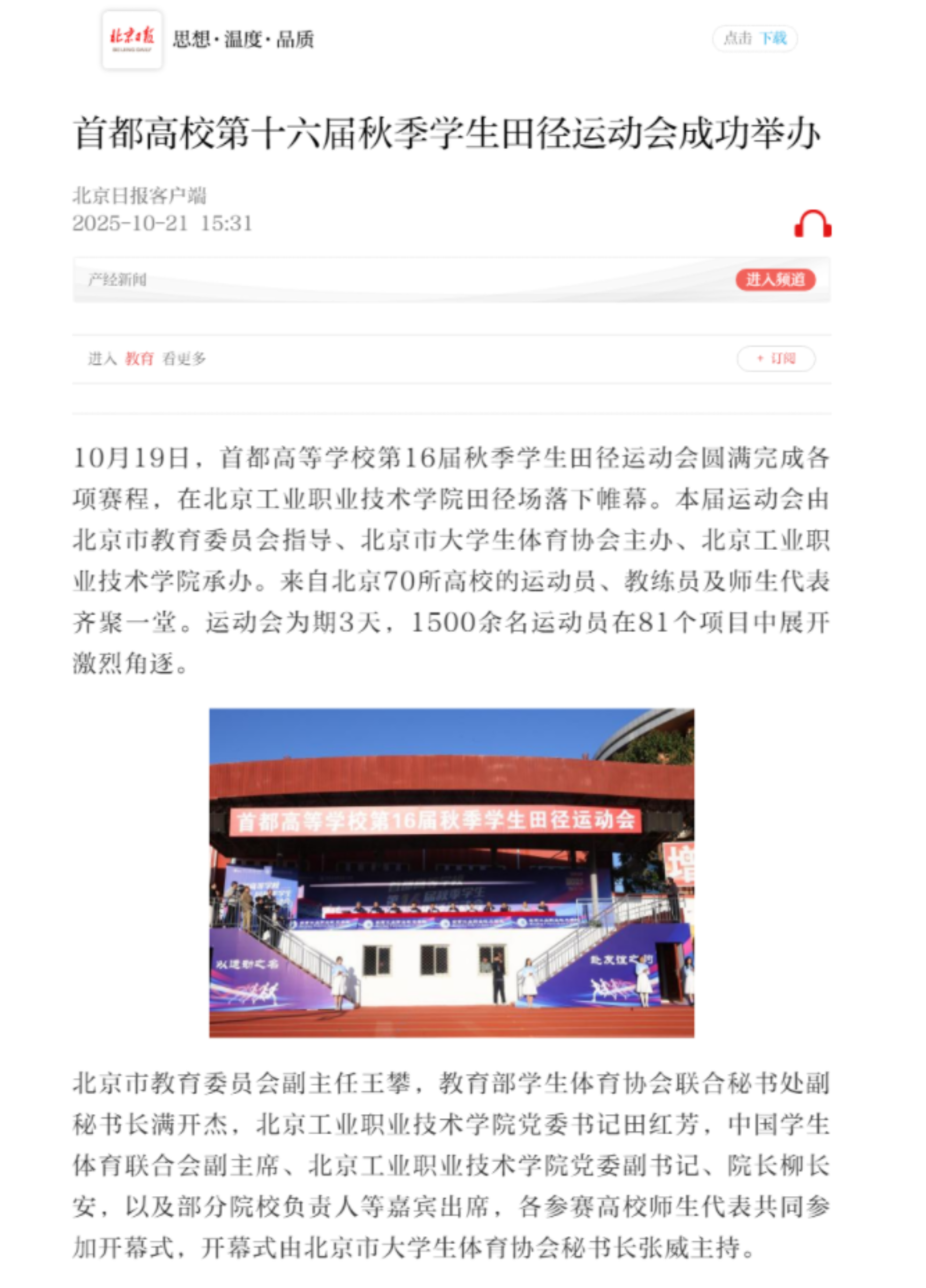 10月19日,首都高等学校第16届秋季学生田径运动会在我校隆重开幕。作为首都高校秋季田径盛会,本届赛事首次落户职业院校,不仅为首都高校体育赛事注入新活力,也彰显了我校在职业教育领域的综合实力。来自首都70所高校的运动健儿在81个赛项中展开激烈角逐,共打破15项赛会纪录,创21人次新纪录。赛事期间,人民日报、中国教育报、中央广电总台国际在线、北京日报、现代教育报、北京电视台等多家主流媒体对运动会进行了报道,聚焦赛场亮点、运动员风采及我校赛事保障工作,全面展现了我校“以体育人、以文化人”的育人理念和体育教育成果。现将媒体报道转载如下: