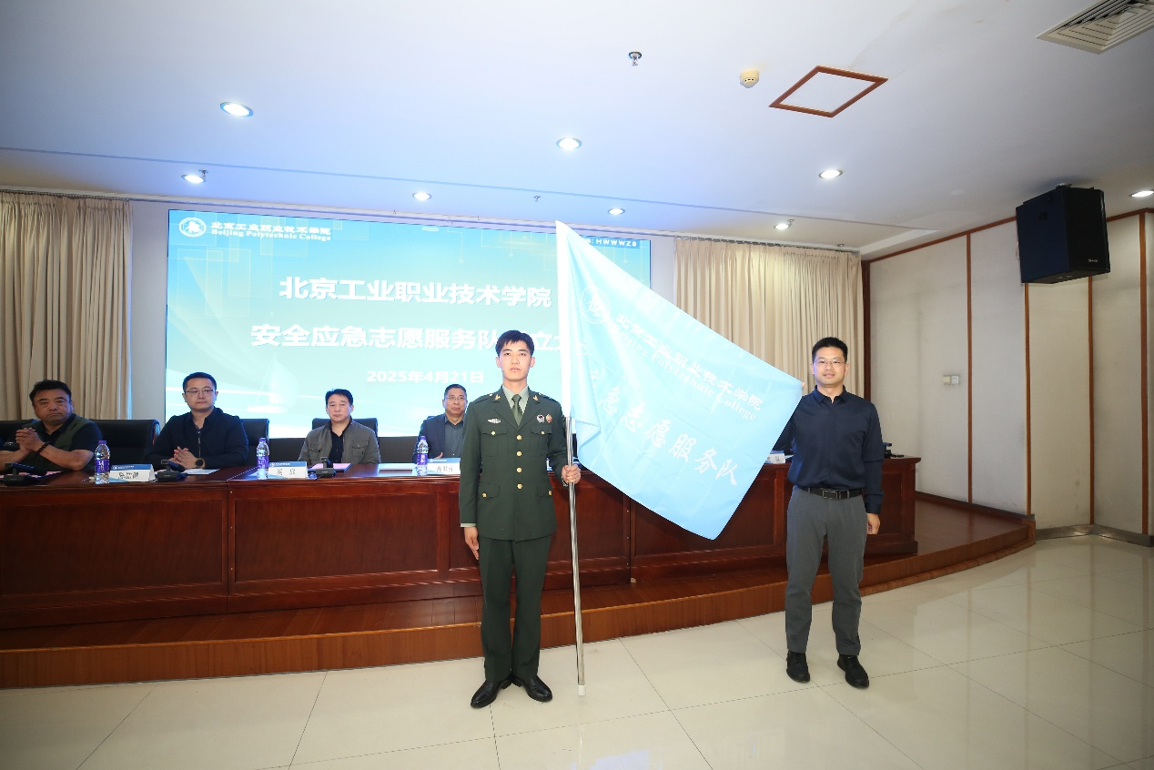高世吉在讲话中深入阐释服务队成立的意义与育人价值。他强调,安全应急志愿服务队的成立,是学校贯彻落实党的二十大关于 “推进国家安全体系和能力现代化” 战略部署的生动实践,更是深化 “职教服务首都发展” 办学定位的重要成果。这一举措不仅是落实 “大安全大应急” 框架的基层创新实践,也是学校推进 “大思政” 育人格局的关键载体。服务队将依托安全技术与管理、智能监测等优势专业,着力构建 “校地应急服务共同体”,通过开展校园应急演练、社区安全科普等多样化实践活动,打造立体化安全传播链条。他提出三点殷切期望:一是秉持工匠精神,深耕专业领域,努力成为应急管理的 “精锐尖兵”;二是强化团队协作意识,凝聚集体力量,锻造能打硬仗的 “应急铁军”;三是以赤诚之心传播安全理念,当好安全文化的 “践行使者”。