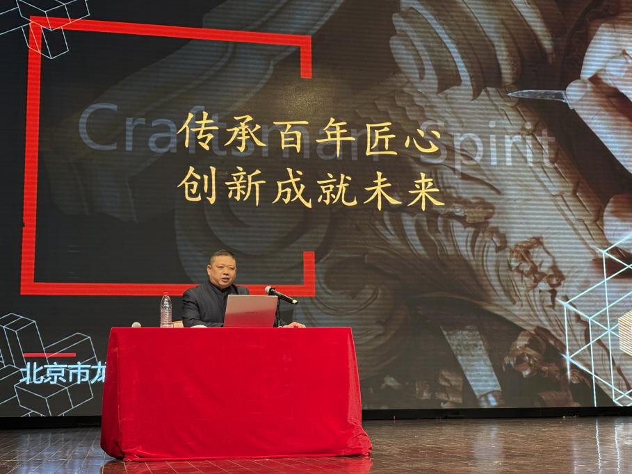 宣讲环节中,刘更生以42年深耕木作的从业经历为脉络,生动诠释了“执着专注、精益求精、一丝不苟、追求卓越”的工匠精神。他从龙顺成163年的非遗传承史切入,讲述了“京作”家具“百年牢”的榫卯匠心,分享了参与新中国成立70周年天安门城楼修缮、2022年北京冬奥会场馆家具制作、国家版本馆器物打造等国家重大工程的使命担当。谈及故宫古旧家具修复工作时,刘更生详细讲解运用现代技术修复同治大婚炕桌、六角宫灯等文物的创新实践,展现了“守正不泥古、创新不离宗”的传承智慧。从学徒时期磨出泡、扎过刺的艰辛到成为行业标杆的坚守,从传统技艺坚守到“科技+非遗”的探索,大师的讲述让在场师生深刻领略到老字号的文化底蕴与大国工匠的责任担当。