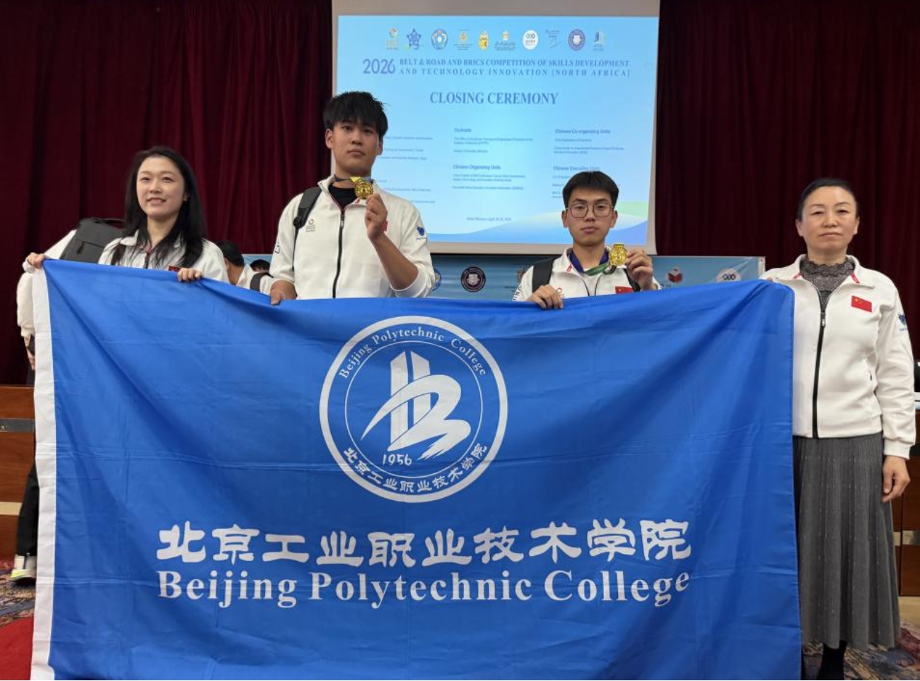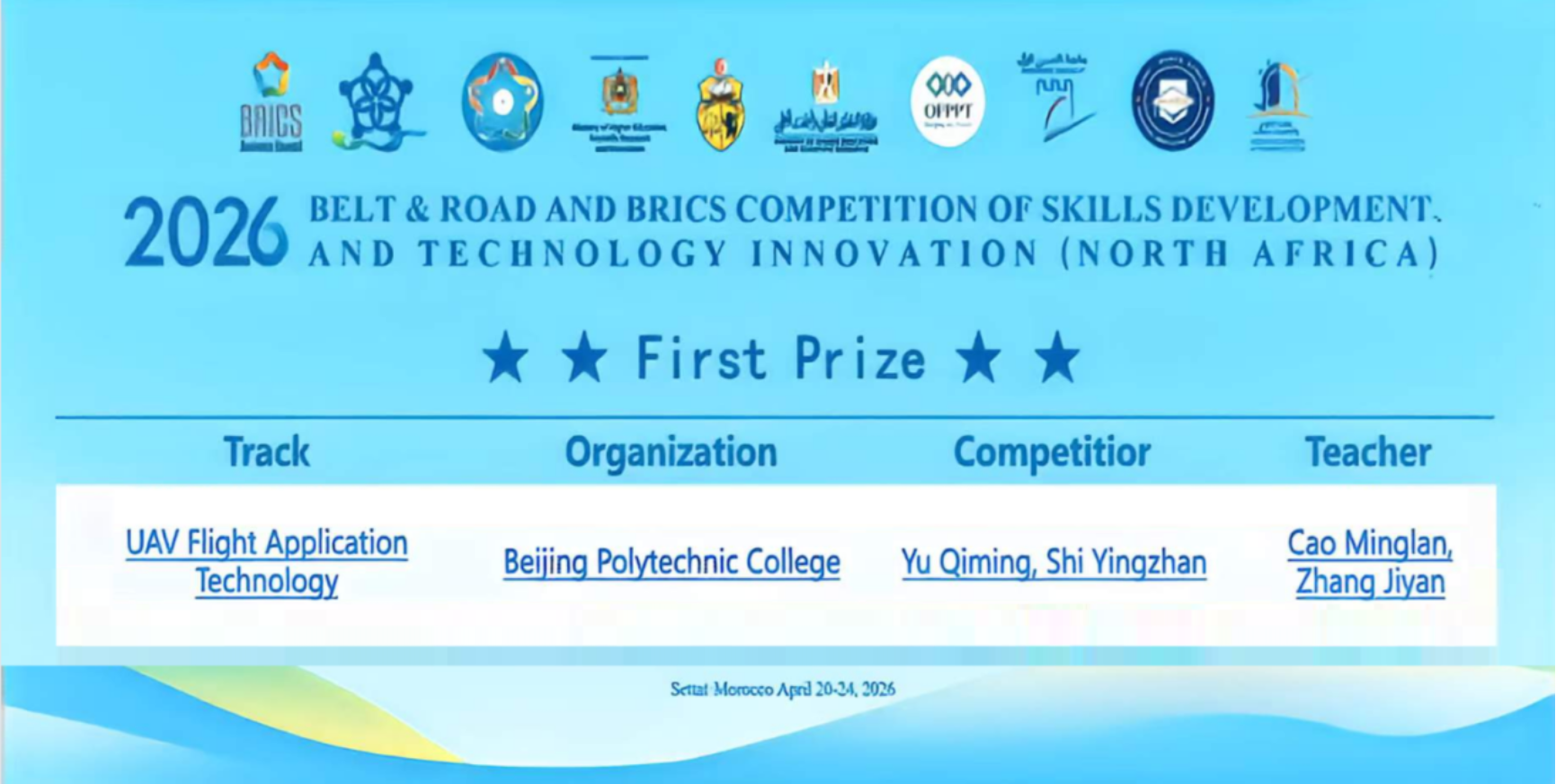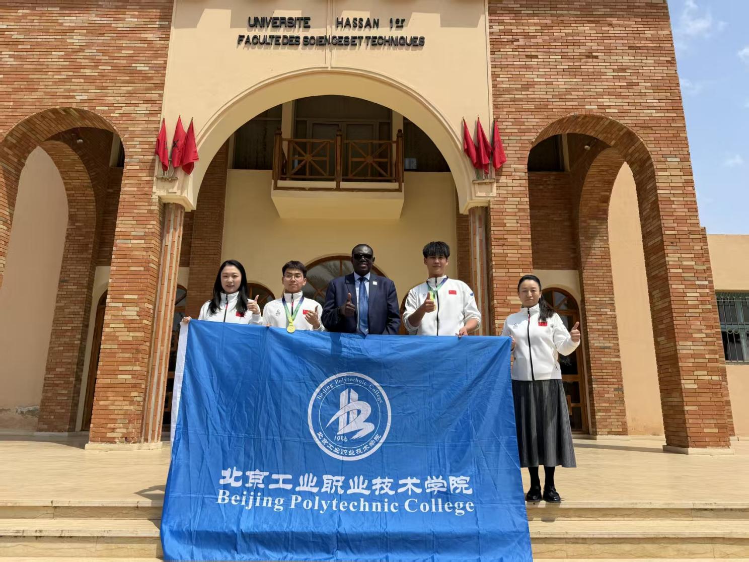 4月20日-25日,2026“一带一路”暨金砖国家技能大赛北非国际赛在摩洛哥卡萨布兰卡举办。我校建筑与测绘工程学院无人机测绘技术师生团队首次代表国家参赛,在无人机飞行应用技术赛项中表现优异,勇夺赛事一等奖(金牌),在国际技能舞台上展现了中国职教风采和我校人才培养过硬成效。