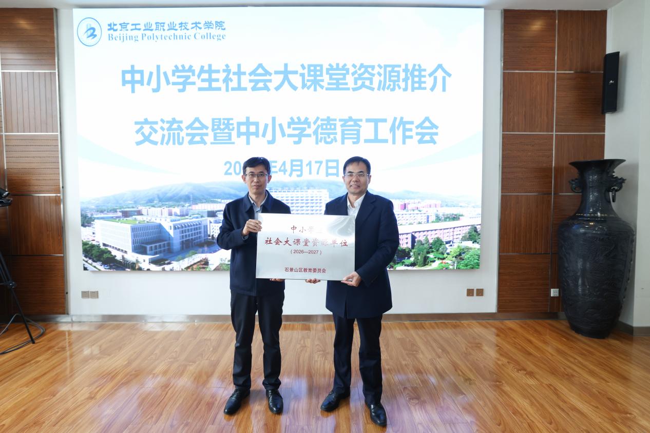 在全体参会人员的共同见证下,石景山区教委副主任刘永奇向机电工程学院授予 “中小学生社会大课堂资源单位” 牌匾,史运涛代表学校接牌。机电工程学院表示,将围绕智能机器人、3D打印技术、智能网联汽车、智慧能效管理等国家战略重点领域,策划形成覆盖不同学段的实践课程体系,深化协同育人机制,切实履行职业教育服务区域教育发展的社会责任。