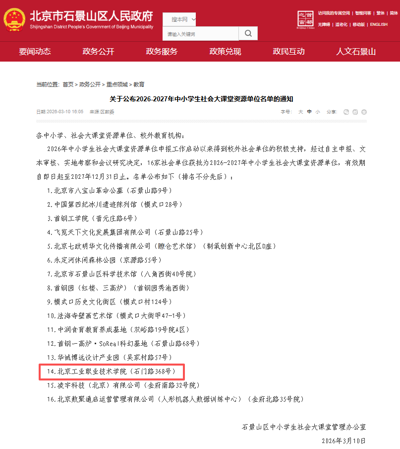 4月17日,石景山区中小学生社会大课堂资源单位授牌仪式暨区域资源推介交流会在北京工业职业技术学院举行。经过前期申报遴选,我校机电工程学院获评石景山区中小学生社会大课堂资源单位,标志着校地协同育人合作迈入新的实践阶段。区教委副主任刘永奇、北京教育学院石景山分院副院长赵丽娜、区公安分局内保支队副支队长张闻涛,各中小学德育负责人、家长代表参会。北京工业职业技术学院校党委常委、副院长史运涛,机电工程学院院长张春芝、继续教育学院院长张波等出席。