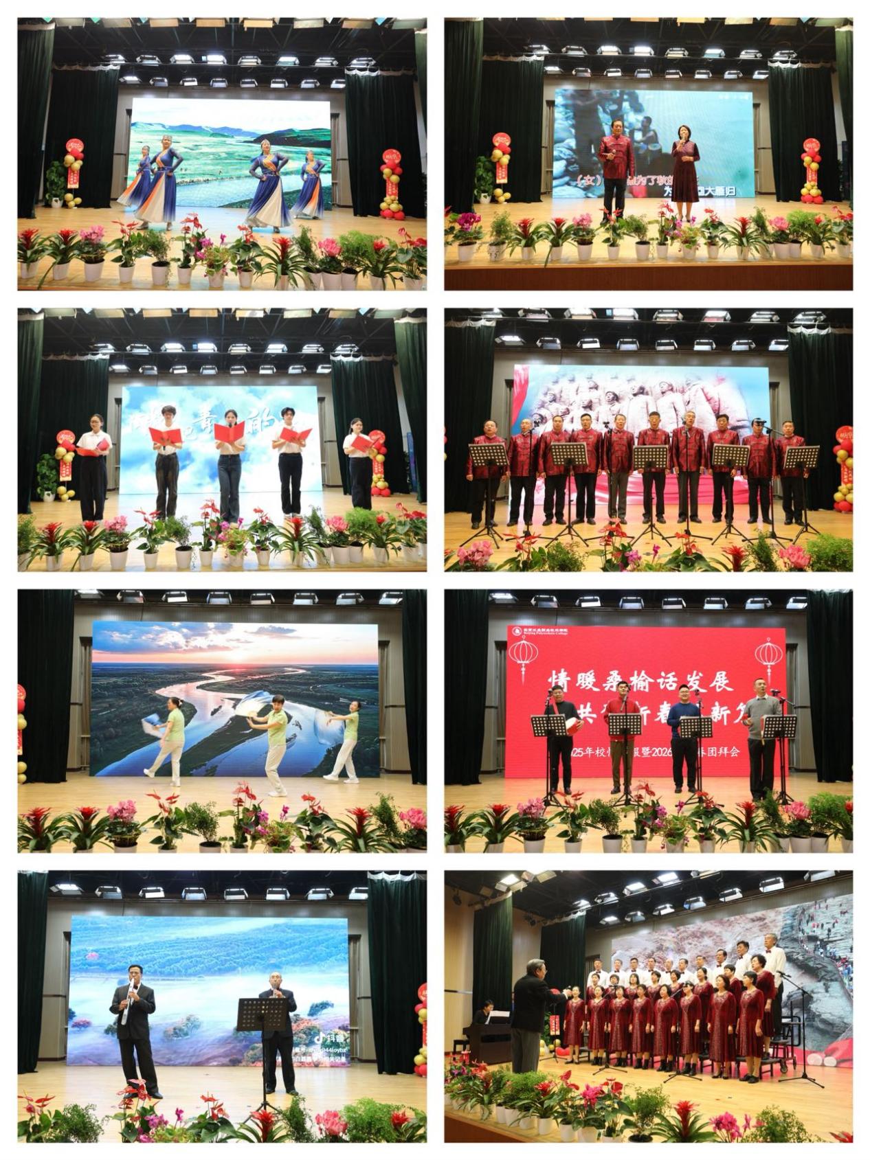 校情通报会后,新春团拜会文艺演出随即登场。舞蹈《吉祥四季》舞动新春祈愿;歌曲《为了谁》深情讴歌奉献精神;学生朗诵《闪光吧 青春的火光》洋溢蓬勃朝气;男声小合唱《我们走在大路上》铿锵有力;舞蹈《一条大河》以优美舞姿抒发家国情怀;三句半《工职风采美名扬》以轻松风趣的语言点赞学校发展;器乐演奏《珊瑚颂》旋律悠扬;最后,北工院银龄之声合唱团以气势恢宏的合唱《壮美延安》将现场气氛推向高潮。演出精彩纷呈,台上台下互动热烈,会场始终洋溢着欢快温馨的气氛。
