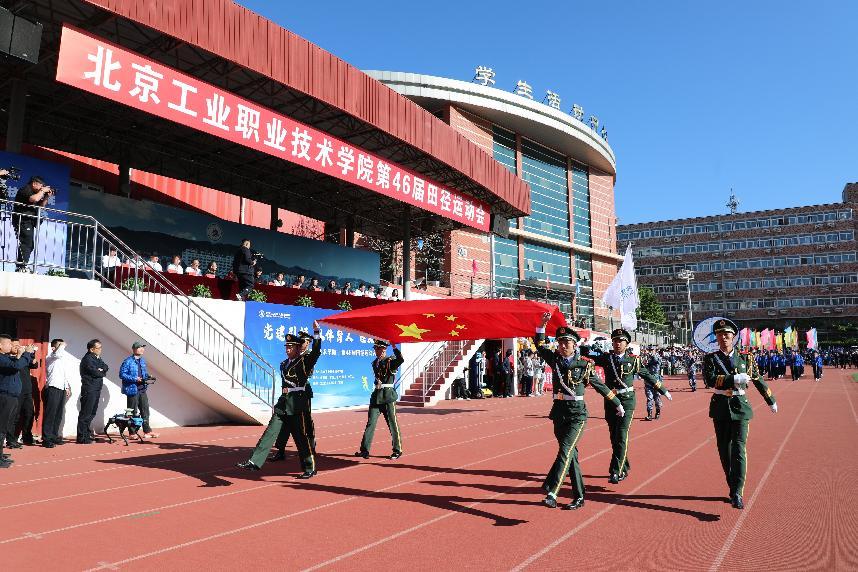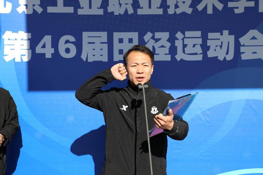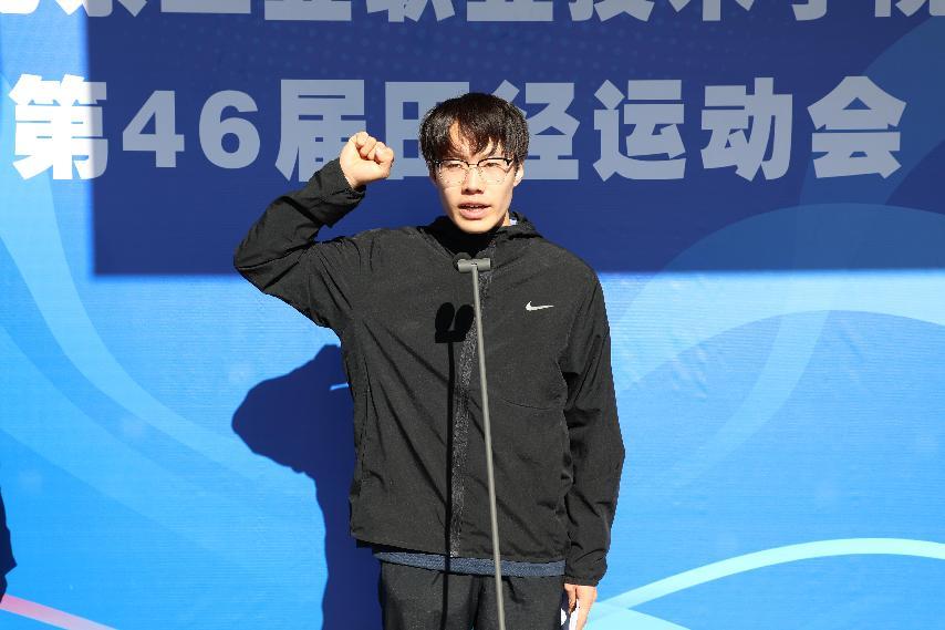 在宣誓环节,运动员代表、裁判员代表进行庄严宣誓。田红芳宣布北京工业职业技术学院第46届田径运动会正式开幕,运动场瞬间沸腾。