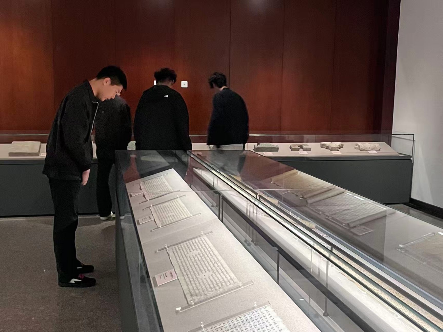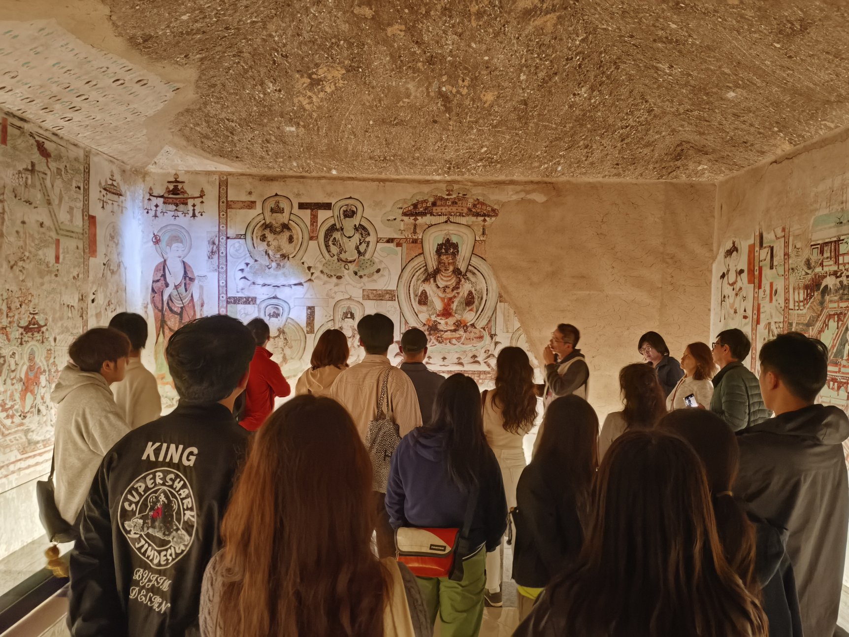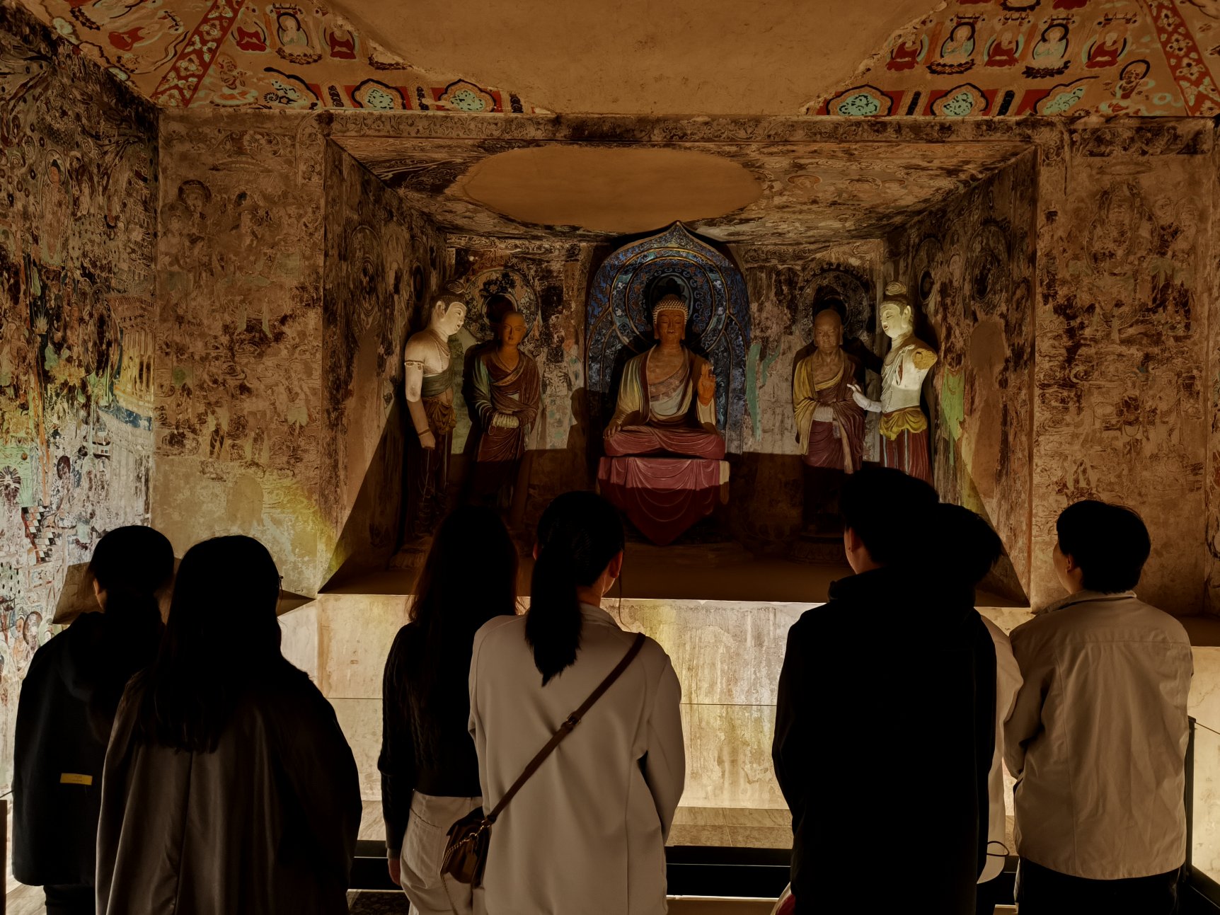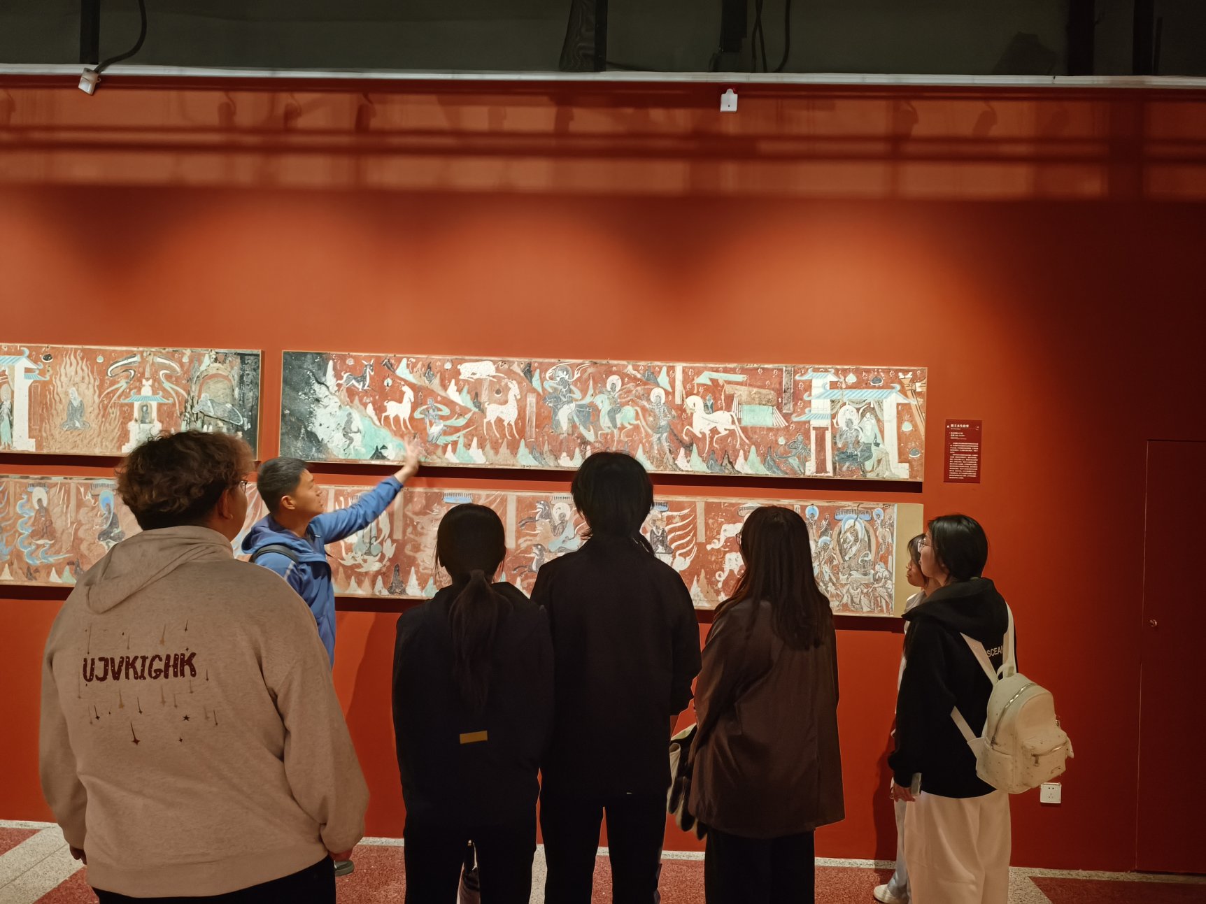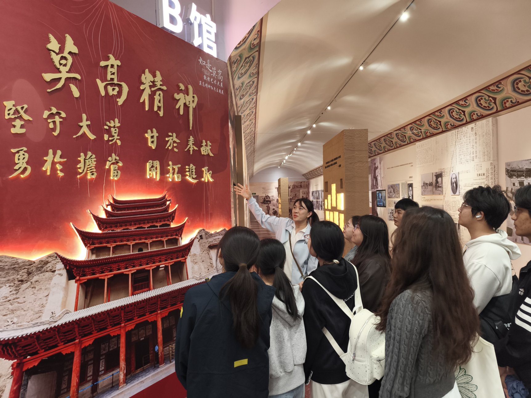 在“莫高精神”红色主题展区,一张张老照片、一段段文献资料、一个个守护故事,生动再现了几代敦煌人“坚守大漠、甘于奉献、勇于担当、开拓进取”的奋斗历程。师生们认真聆听讲解、交流感悟,深刻体会文物守护者扎根戈壁、为国护宝的赤诚与担当,在历史与现实的对话中接受精神洗礼。
