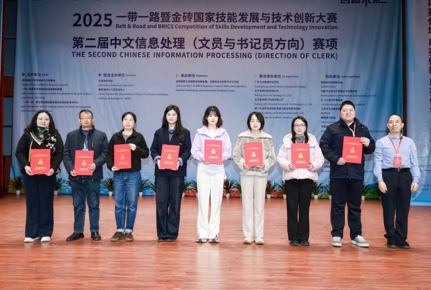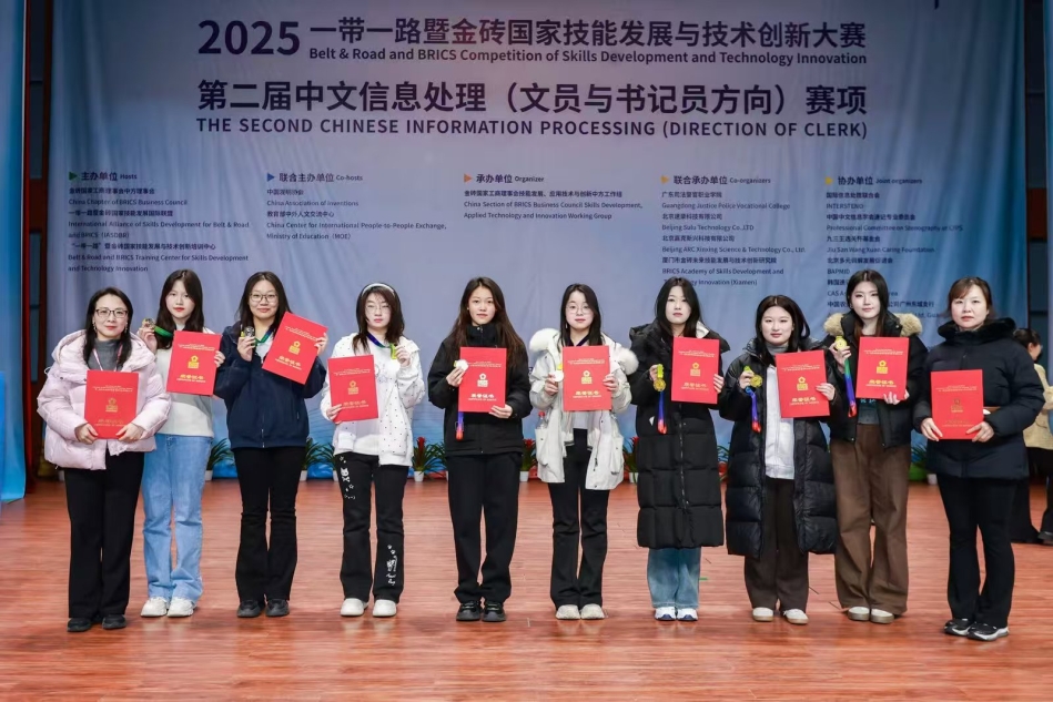 近日,2025“一带一路”暨金砖国家技能发展与技术创新大赛第二届中文信息处理(文员与书记员方向)赛项决赛在广东司法警官职业学院圆满落幕。本届赛事吸引了来自国内62所院校的100支代表队、347名师生,以及韩国、捷克、意大利等6个国家的选手同台竞技。我校文法与管理学院选派的师生代表在比赛中奋勇争先,展现出扎实的专业功底和良好的精神风貌,斩获多项殊荣。