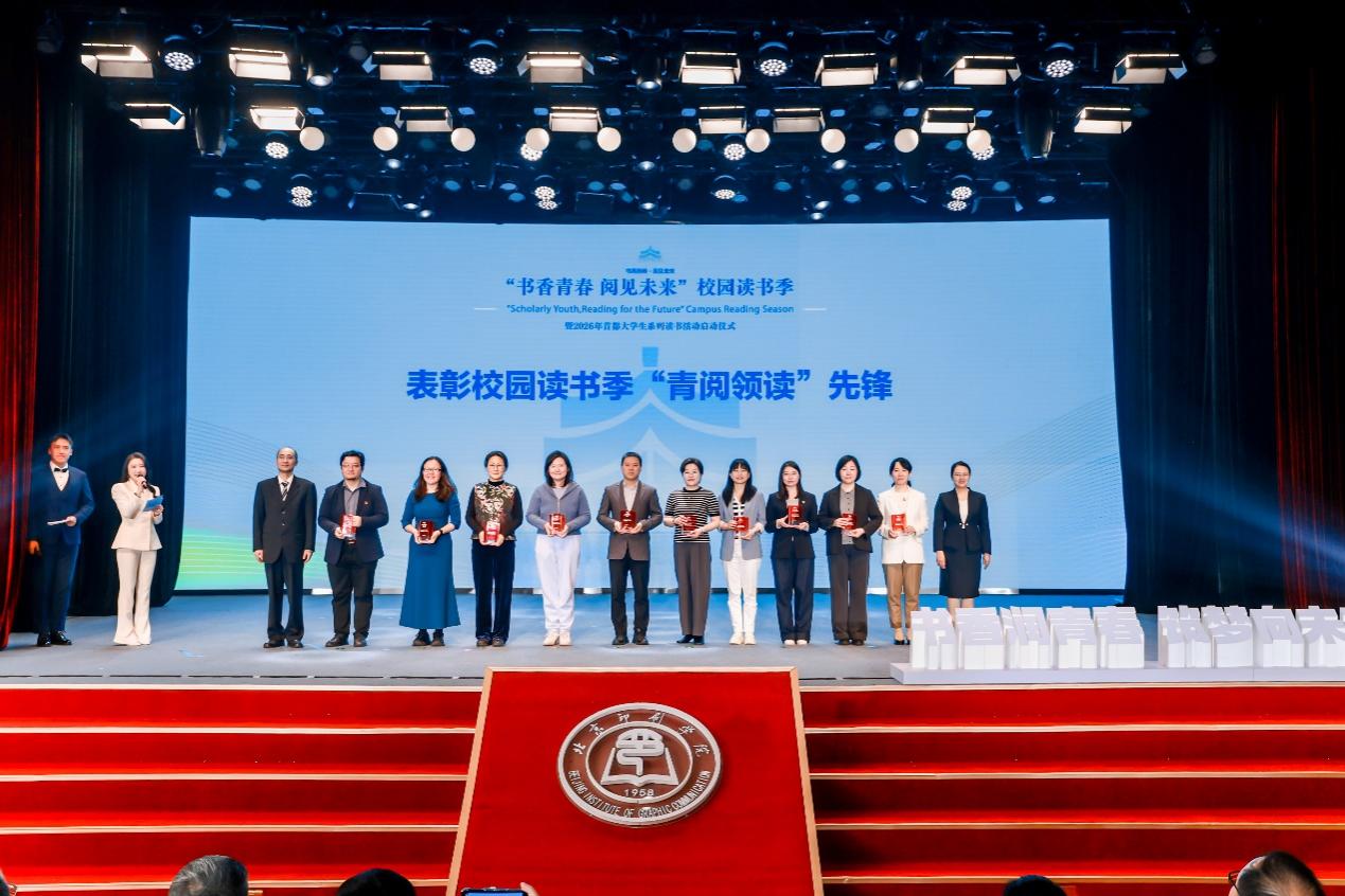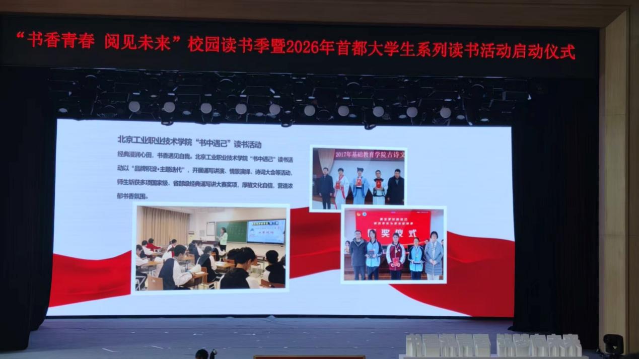 4月18日下午,“书香青春 阅见未来”校园读书季暨2026年首都大学生系列读书活动在北京印刷学院启动。活动现场,集中表彰校园读书季优秀读书品牌。由我校团委和基础教育学院联合报送的“书中遇己”读书活动,获北京高校校园读书季“青阅领读”榜样称号。