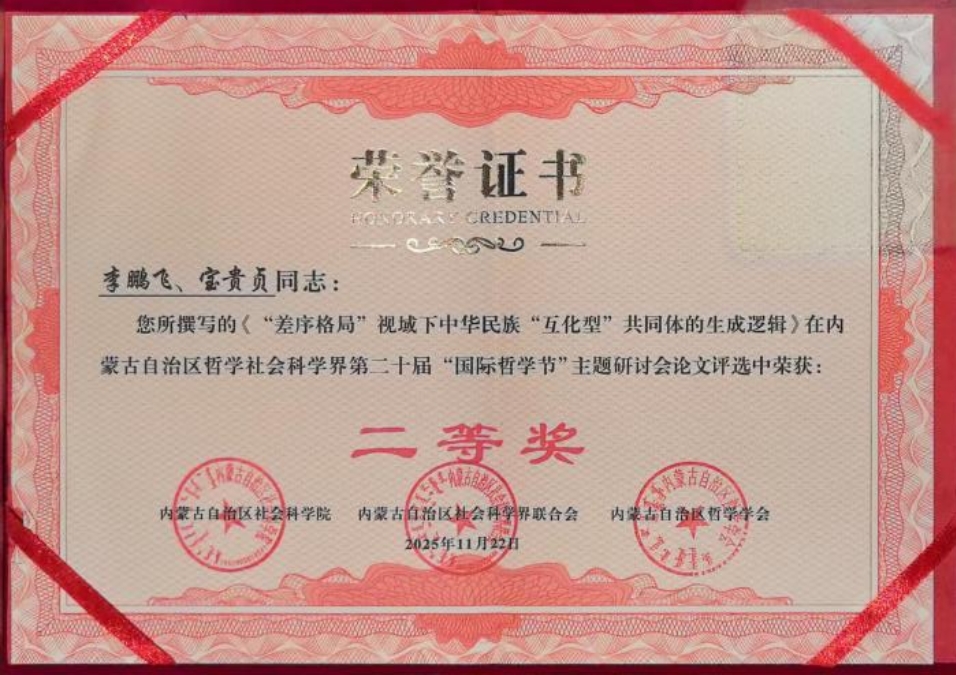 近日,内蒙古自治区哲学社会科学界第二十届“国际哲学节”主题研讨会在呼和浩特举办。本届研讨会聚焦“中国哲学与地域文化”,吸引清华大学、北京大学等国内多所高校及科研院所投稿146篇,学术竞争激烈。我校马克思主义学院李鹏飞老师受邀参会,其提交的论文《“差序格局”视域下中华民族“互化型”共同体的生成逻辑》经严格评审,从众多优秀稿件中脱颖而出,荣获二等奖。