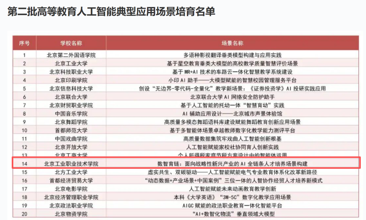 近日,北京市教委公布首批人工智能应用场景标杆学校培育名单,我校成功入选首批 50 所培育学校。同时,在北京市第二批高等教育人工智能典型应用场景评选中,我校申报的“数智育链:面向战略性新兴产业的 AI 全链条人才培养场景构建”项目脱颖而出,成为全市 20 个典型应用场景之一,实现市级荣誉双丰收。