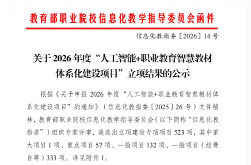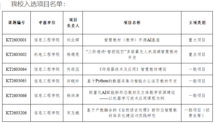 近日,教育部职业院校信息化教学指导委员会公布2026年度“人工智能+职业教育智慧教材体系化建设项目”立项结果。我校共6项课题成功入选立项,立项整体成效位居同类院校前列。其中信息工程学院牵头5项、机电工程学院牵头1项,涵盖人工智能、智能制造、低空装备、大数据教学等重点专业领域。尤为突出的是,信息工程学院刘业辉教授牵头申报的《智慧教材(教学)开源AI基座》获批为本年度全国唯一重大项目。这一成绩充分彰显了我校在人工智能赋能职教智慧教材建设、数字化教学资源研发领域的过硬实力与示范引领作用。