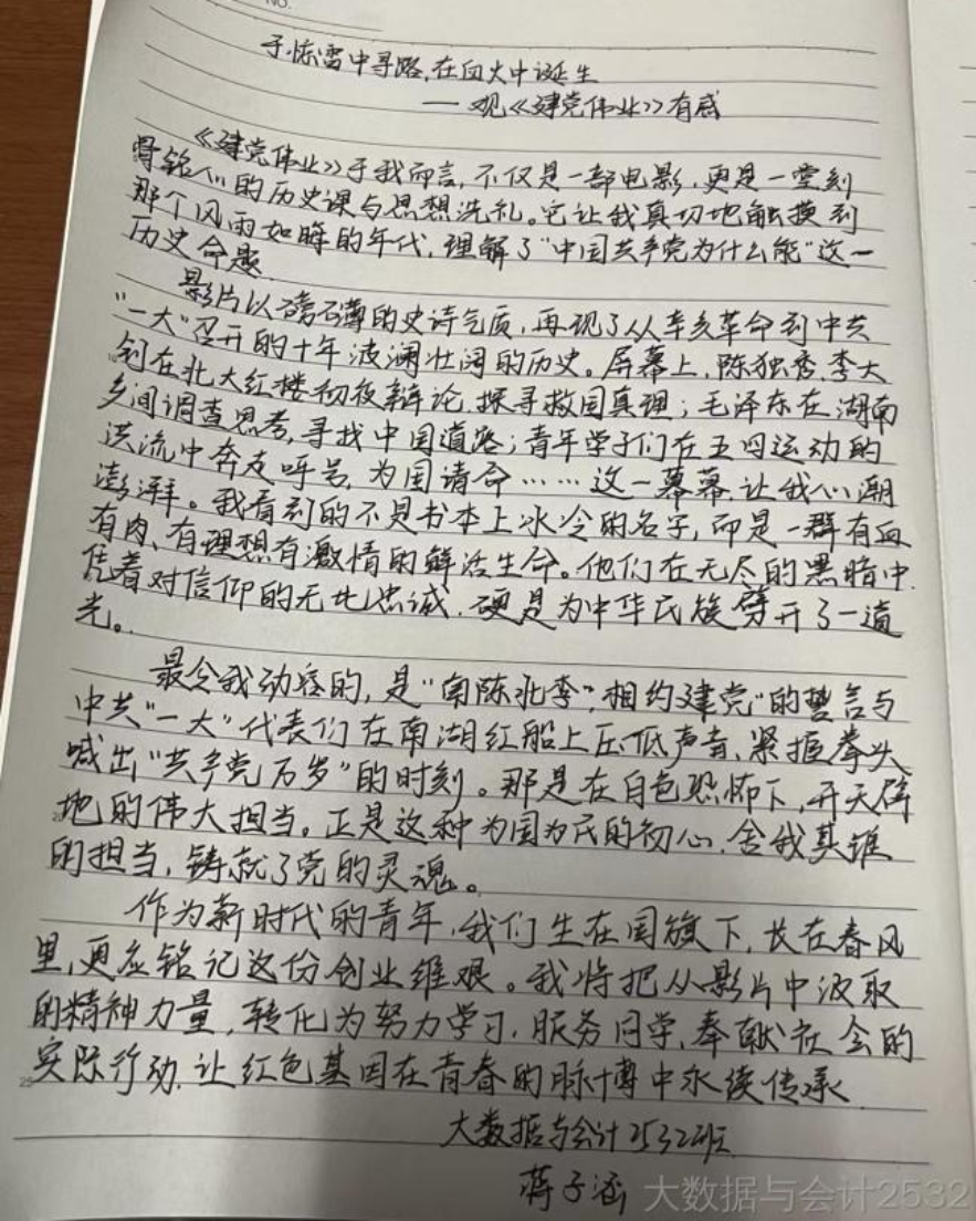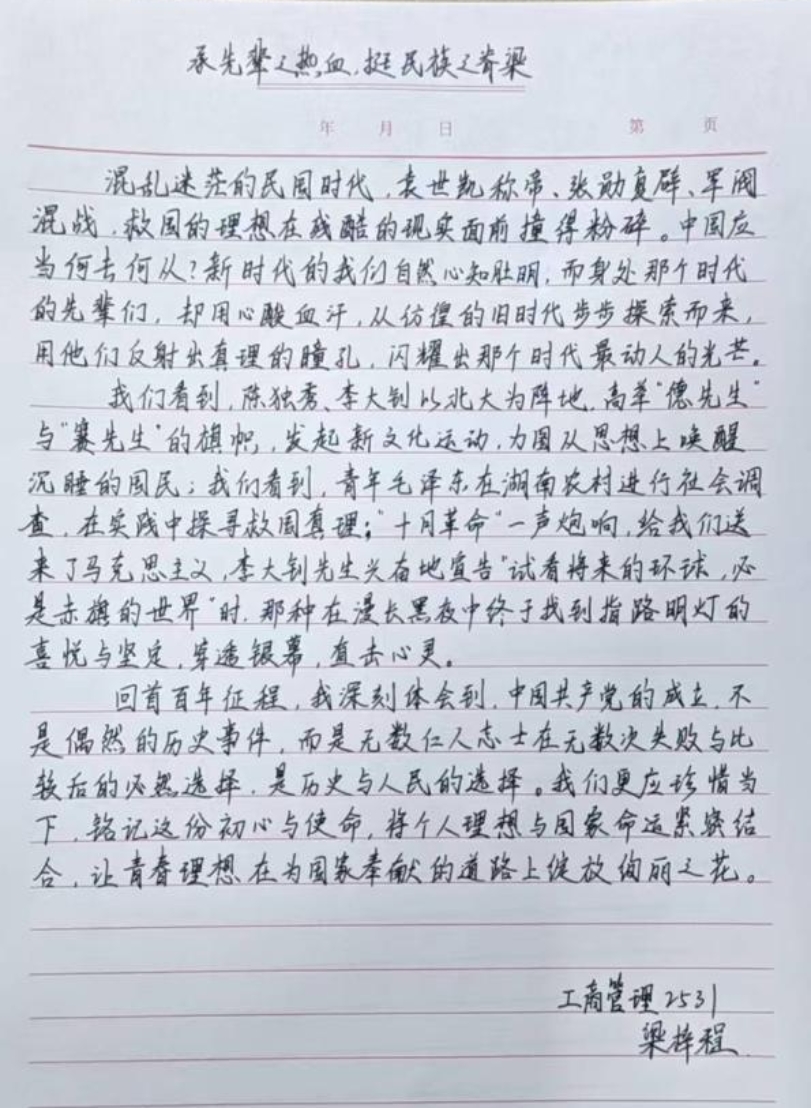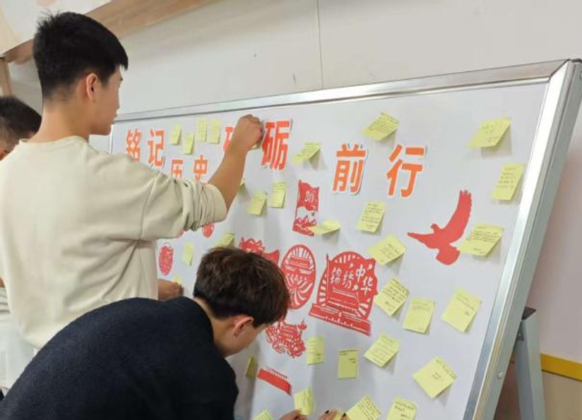 建筑与测绘工程学院“青春寄语新时代”留言活动中,同学们执笔写下赤子之心,让留言墙成为凝聚报国之志的生动载体;文法与管理学院在观影后组织观后感书写,推动爱国主义精神内化于心、外化于行。