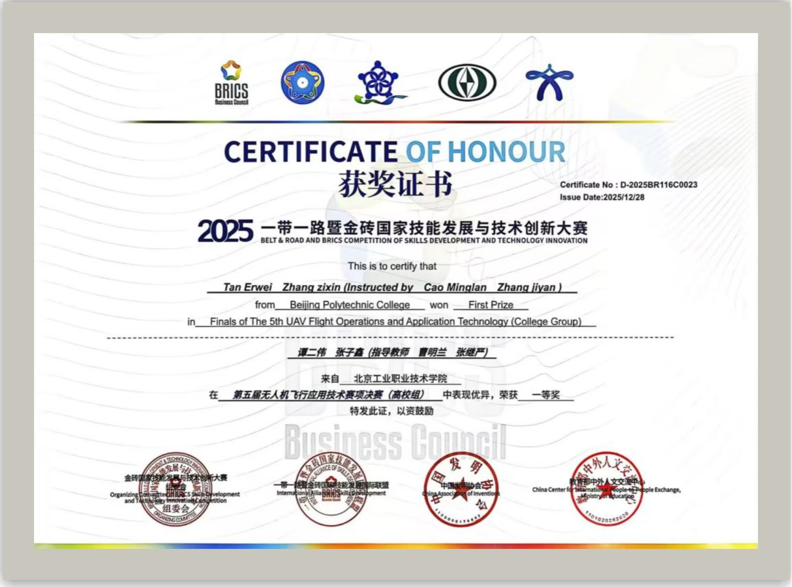 决赛现场,我校选手沉着冷静、默契配合,在实操竞赛中展现出高超的无人机检修技能、飞行操控技巧和良好的职业素养。面对复杂的竞赛任务和强劲的竞争对手,他们精准高效完成各项实操要求,最终以总分第一的优异成绩斩获高校组一等奖(金牌),参赛选手谭二伟、张子鑫荣获金牌,指导教师曹明兰、张继严获评“优秀指导教师”,学校获“最佳组织奖”荣誉称号。根据赛事晋级规则,我校获得2026年4-5月在摩洛哥卡萨布兰卡举办的北非国际赛未来技能挑战赛参赛资格。