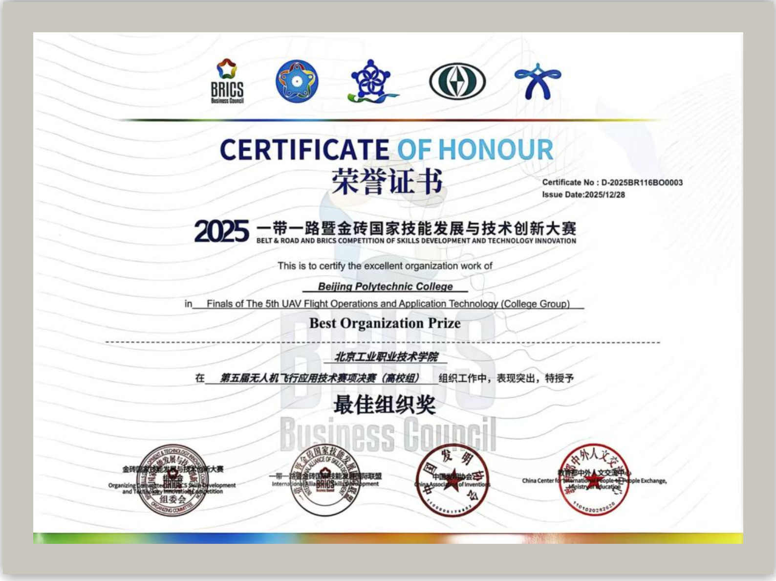 本次大赛由金砖国家工商理事会中方理事会、一带一路暨金砖国家技能发展国际联盟、一带一路暨金砖国家技能发展与技术创新培训中心联合主办,是金砖国家技能领域的高规格、权威性赛事。大赛旨在搭建国际化的技能发展与技术创新合作平台,推动技术技能人才培养模式与专业建设的深度改革。经过9月份的初赛严格筛选,共有30所高校脱颖而出,获得高校组决赛资格。赛事对选手的无人机系统检修、精准飞行操控、应急处理能力及职业素养等综合能力提出了极高要求,竞争异常激烈。
