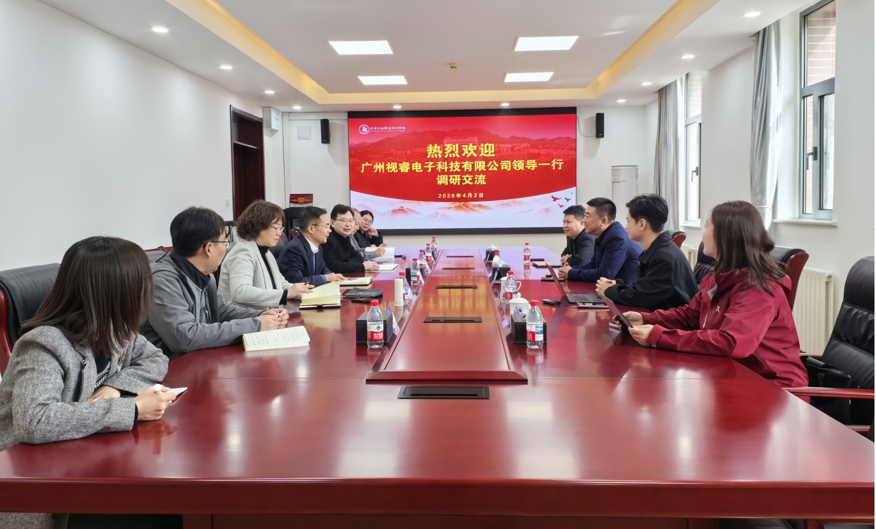 4月2日下午,广州视睿电子科技有限公司北京子公司总经理杨威、广州视睿电子科技有限公司产教融合部总监钟立强等一行4人来校交流访问,校党委常委、副院长史运涛接待来访客人。