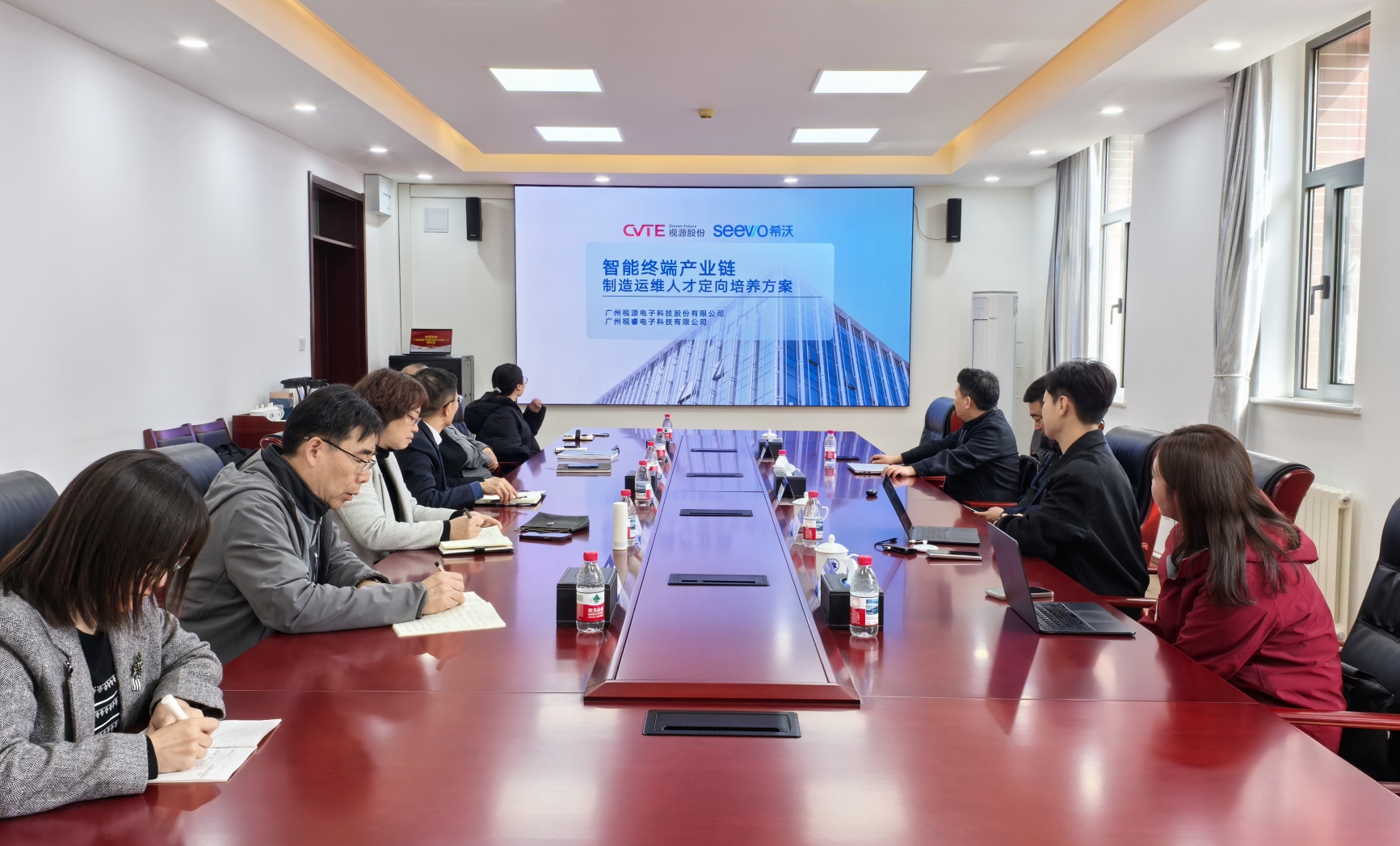 杨威介绍了广州视睿北京子公司基本情况,钟立强介绍了企业概况、岗位人才需求、校企合作方案及成功案例,校企双方围绕校企合作模式、人才培养、实习就业等共同关心的话题进行了深入交流。校企双方就春季校园招聘会等事宜达成共识,并对下一步具体合作项目会商了基本框架。