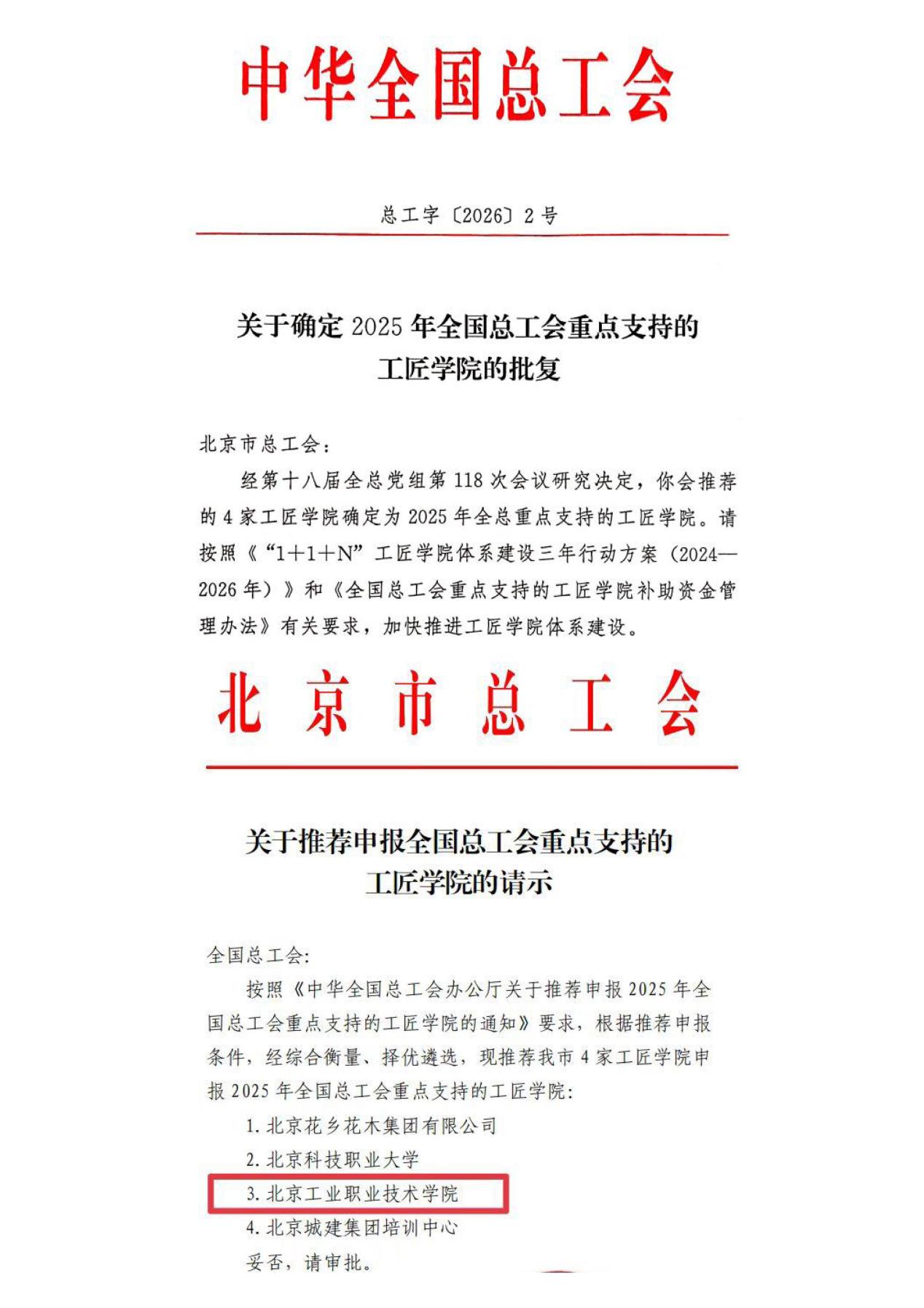 近日,中华全国总工会印发《关于确定2025年全国总工会重点支持的工匠学院的批复》,我校首都工匠学院成功入选全国总工会重点支持的工匠学院,成为北京市4家获此殊荣的单位之一。